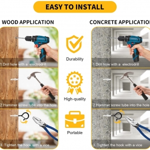 - Easy Installation: Please hammer the hanging hooks into the wood and then tighten it with pliers. If you want to put it on the wall, please drill a hole at first, and then put it in the plastic pipe, and finally tighten it.