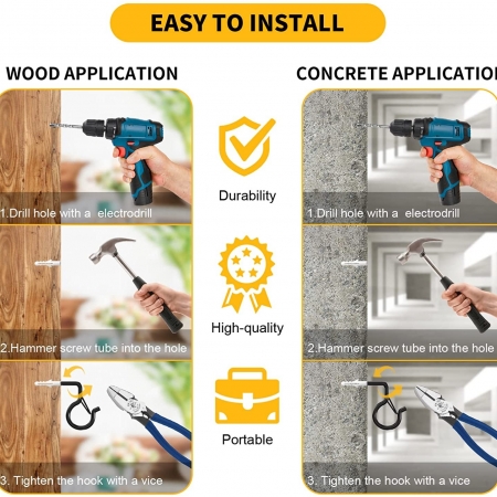 - 【Easy Installation】Please hammer the hanging hooks into the wood and then tighten it with pliers. If you want to put it on the wall, please drill a hole at first, and then put it in the plastic pipe, and finally tighten it.